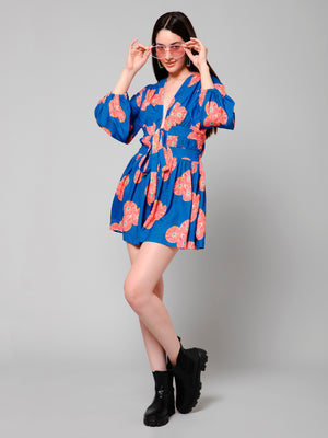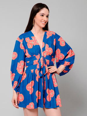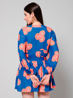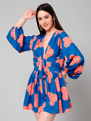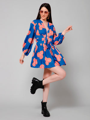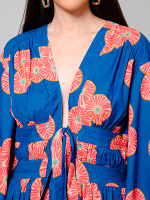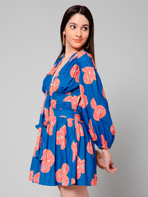 This classy piece of design has an amazing aesthetical detail into it sleeve yoke with gather details and broad belted waistlines tied up in the front and nice volumed sleeves with gathered waistline is perfect for your branch with friends and family! Adele Cobalt Blue Sliced Citric Fruit Print Deep V Neck at the Front And an Elegant Fit Mini Dress.