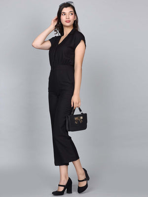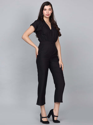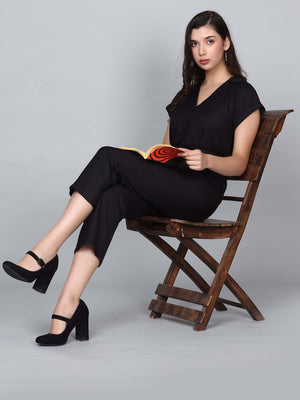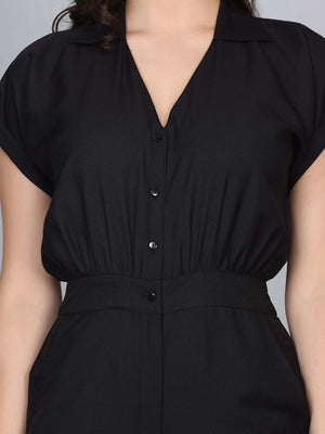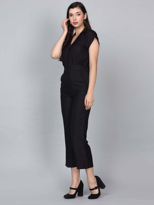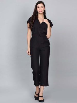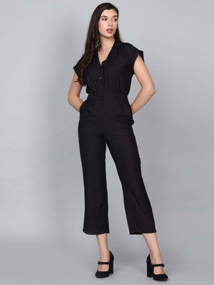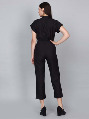 This chic style Jumpsuit in solid black with front button closure, stylized sleeves and pocket details making it a big hit for this season, creating FOMO in the category.