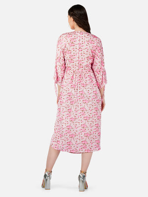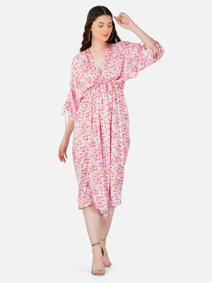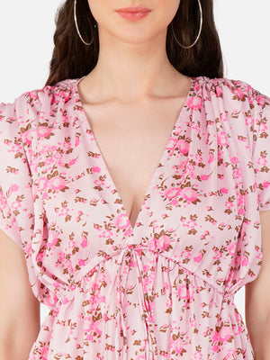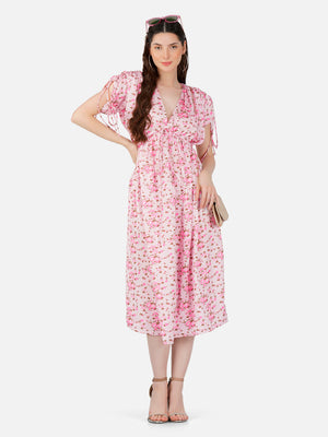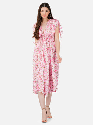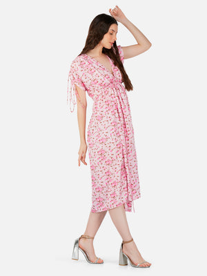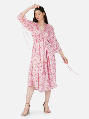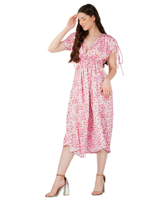 Our Angel pink floral Dress with placement detailed tie-ups beautiful V-neck line with draw up sleeves.