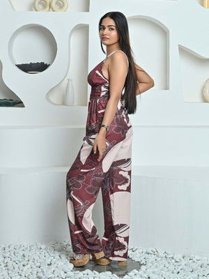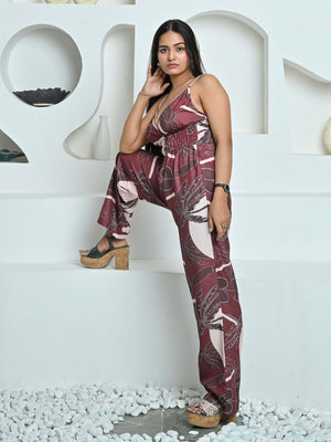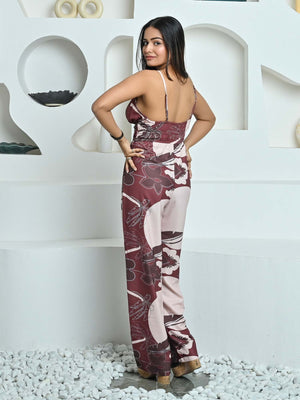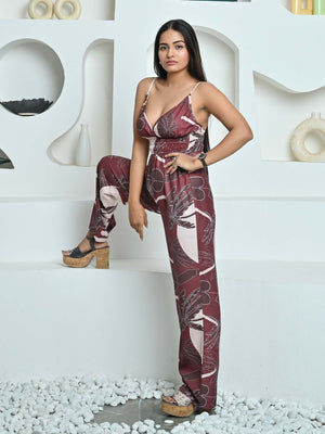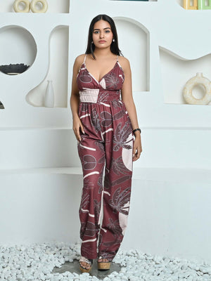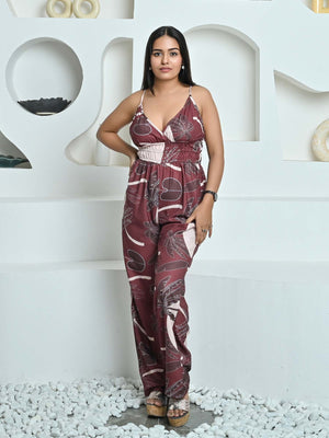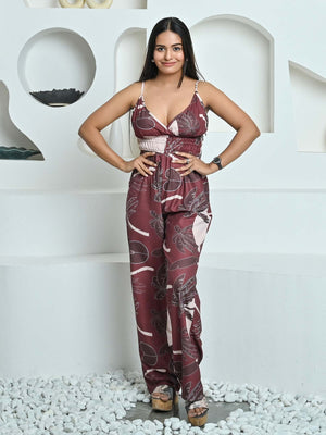 Perfect for a night out with friends or office party this chic style party Jumpsuit in brown beige tropical sun print with details on waistline, sleeveless and strappy details making it a big hit for this season, creating FOMO in the category.