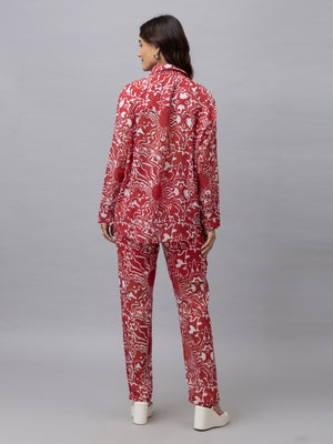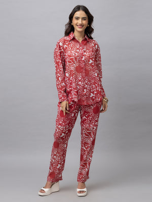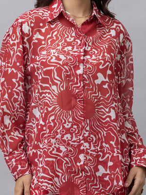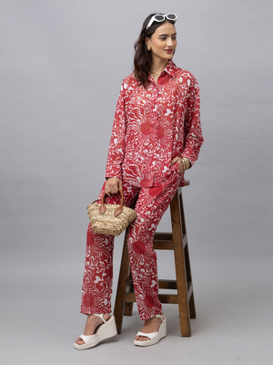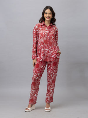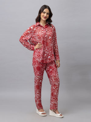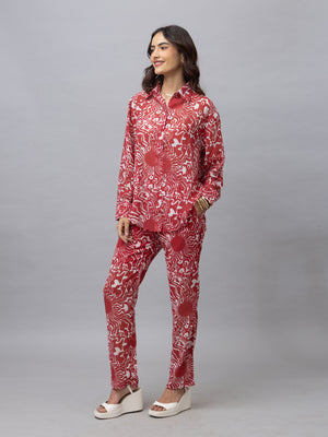 Cassie red abstract print co-ord set is the perfect blend of comfort and fashion. Its vibrant print and versatile design make it a must-have addition to your wardrobe. Cassie printed relaxed co-ord set features a long-sleeved button-up shirt and matching pants, both adorned with a bold red abstract print in shade ofwhite. Crafted for both comfort and style, this set is perfect for making a statement while staying effortlessly chic.