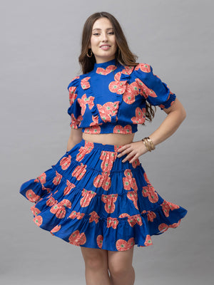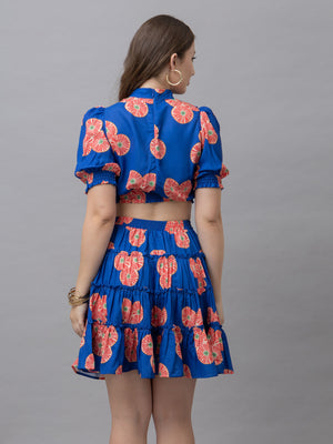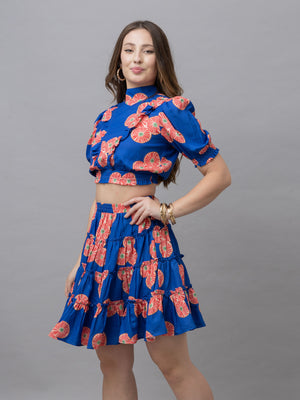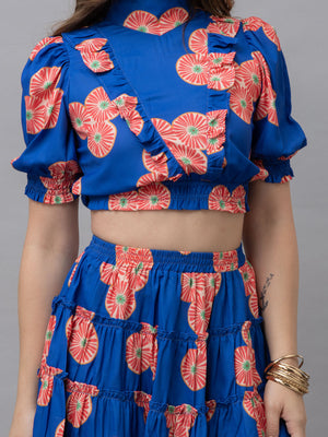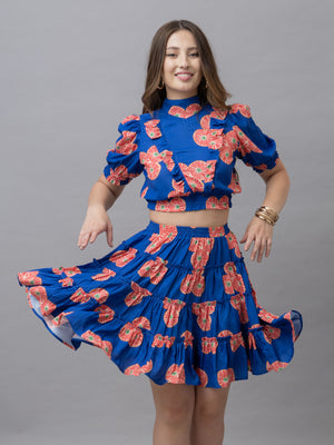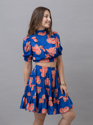 Chloe co-ord set features a vibrant cobalt blue and orange fruit print, perfect for making a statement this summer. The set includes a cropped blouse and a tiered mini skirt, both designed to offer a fresh and feminine aesthetic. Whether you're dressing up for a special occasion or keeping it casual, this set will ensure you look stylish and on-trend.