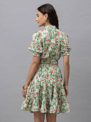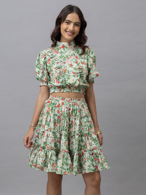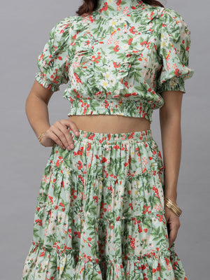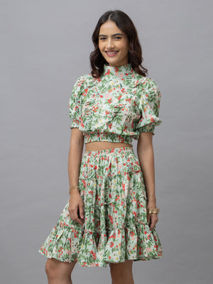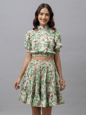 Chloe co-ord set features a vibrant cobalt blue and orange fruit print, perfect for making a statement this summer. The set includes a cropped blouse and a tiered mini skirt, both designed to offer a fresh and feminine aesthetic. Whether you're dressing up for a special occasion or keeping it casual, this set will ensure you look stylish and on-trend.