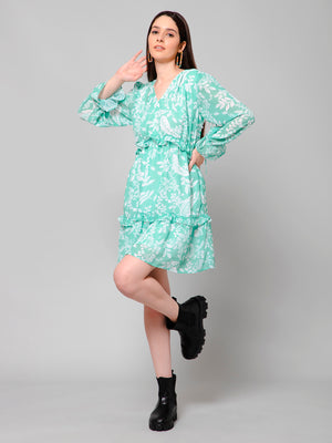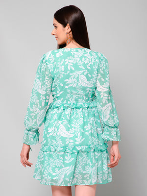 Ebonee Green Tropical Print Long Sleeves Mini Dress