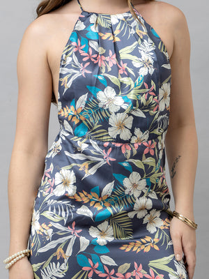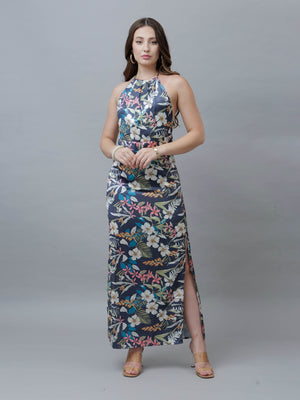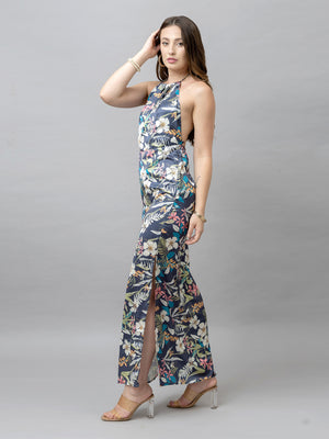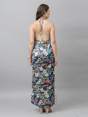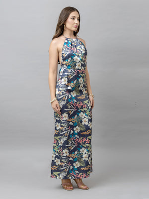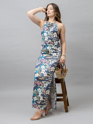Eleanor grey tropical print maxi dress combines elegance and comfort, perfect for a variety of occasions from casual outings to more dressy events. Pair it with vibrant green hoop earrings to create a chic and eye-catching outfit perfect for various occasions, from casual gatherings to more festive events.