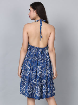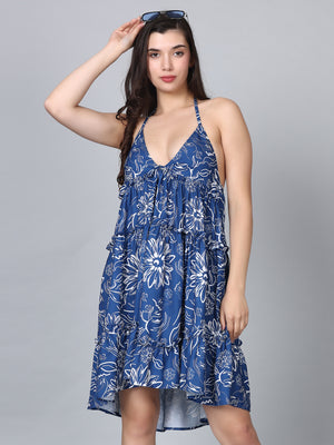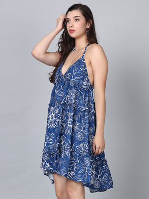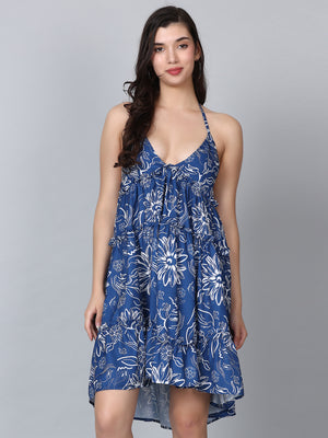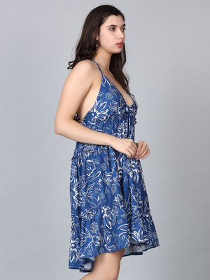 Gaia Blue Floral Print Strap Shoulder Mini Dress