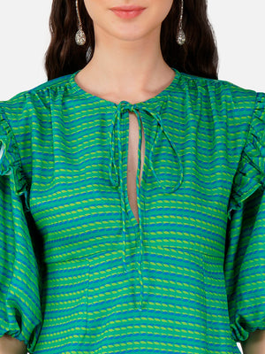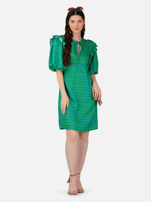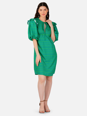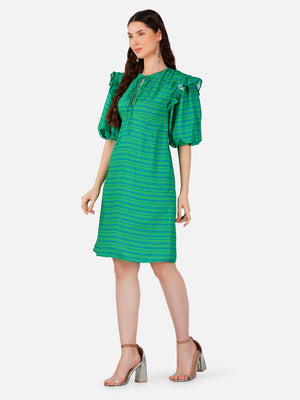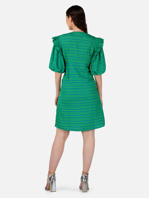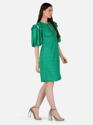 This green geometrical printed dress with keyhole neckline in the front and volume gathered sleeves with ruffle details on the armhole.