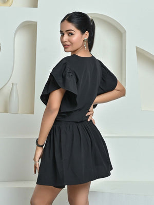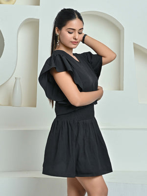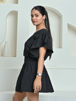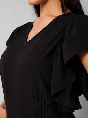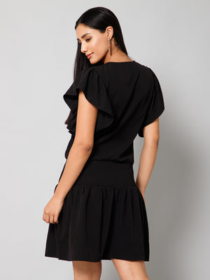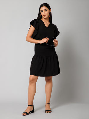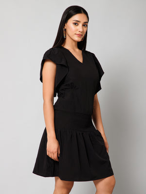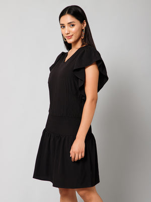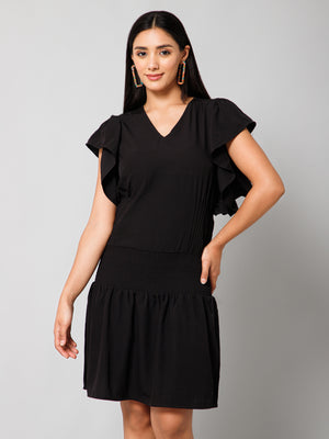 Elegant and minimal yet knock-out detail of smocked waistline with pin-tucks along with flutter sleeves and V neckline this dress is perfectly suited for this season.