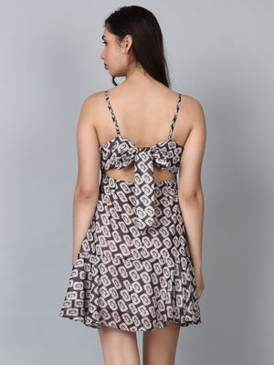 This pretty perfect date dress with peplum on the hemline, strappy shoulder and cut out detail at the back with tie up is perfect for your evenings! Buy Iris Beige Abstract Print Cross Over Mini Dress with Cut Out And Tie Up Detail at the Back.