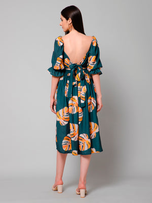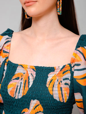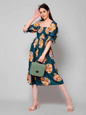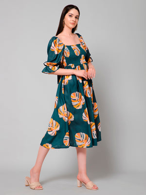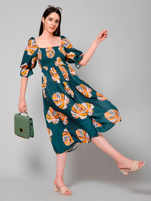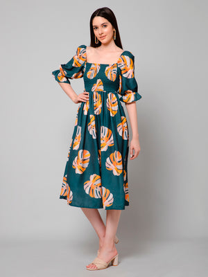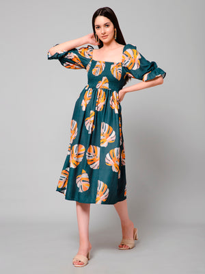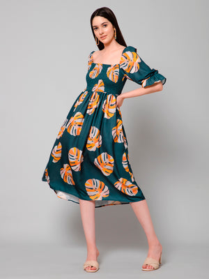 This Jasalina dress has nice tropical big leafy prints and 3/4th puff sleeves with ruffled cuffs and smocked bodice, gather on the waistline, fit and flayer midi dress is perfect for your style statement.