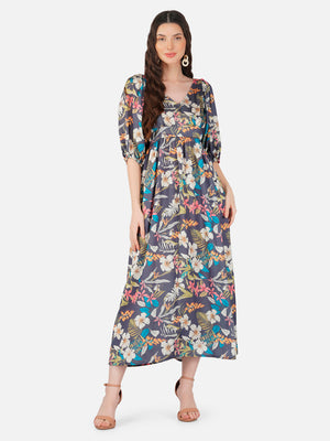 Juliana Satin Long Dress is elegant and classy always makes you very stunning and feminine. This back cross details gathered tropical floral dress with nice voluminous sleeves enhance your elegance on your special occasion.