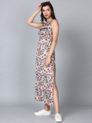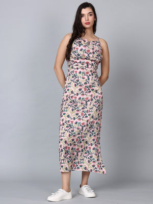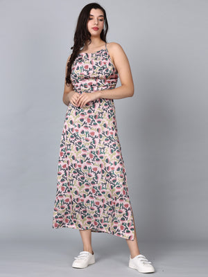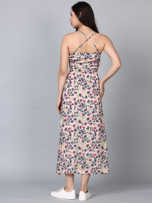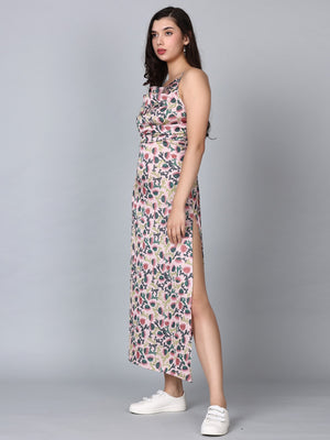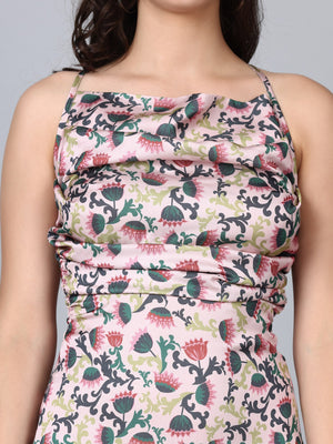 Hauteque Coral Floral Print Cowl Neck Slip Dress with tie-up shoulder in satin. This slinky slip dress is crafted in beautiful floral print with side slit and shoulder strap details.