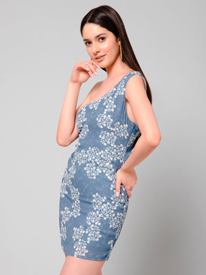 The amazing floral print date dress with one side shoulder look making it’s really pretty and chic for this hot summer. Lysa blue bonnet ditsy print thigh length bodycon dress with one side shoulder.