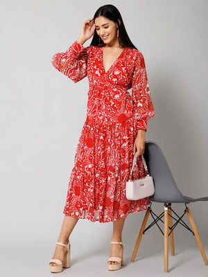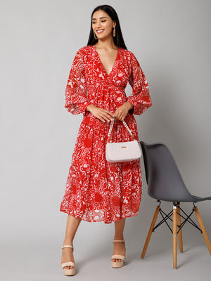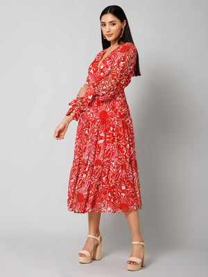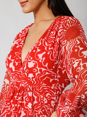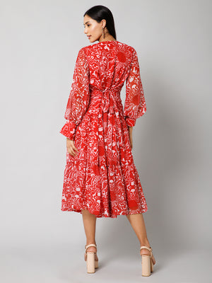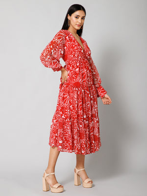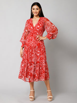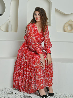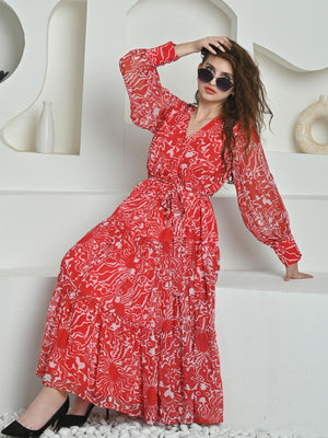 Mandira White Red Abstract Print Calf Length Tiered Dress with Gathered Long Puff Sleeves Nice Cuff Details. Perfect day to dinner classy chic long maxi dress with beautiful gather detail on the sleeves and abstract print is perfect for this season.