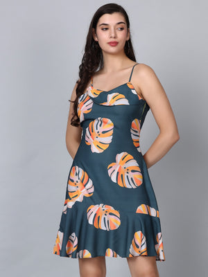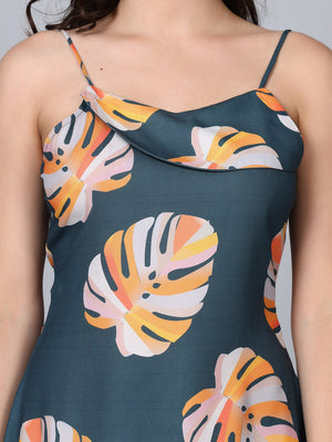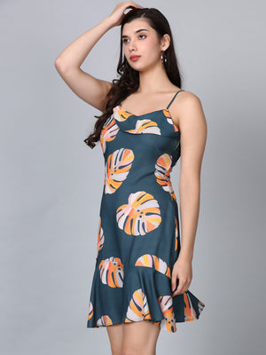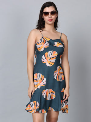 Perfect day-out classy chic short dress with beautiful ruffled detail multicolored tropical leaf print for an evening also can wear this season. Renee green tropical print above knee length straight dress with ruffle shoulder strap and asymmetrical peplum on front.