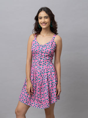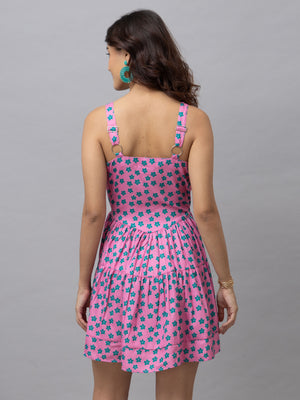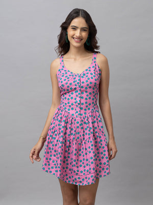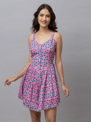 Embrace the vibrant spirit of the season with this delightful pink floral print mini dress. Designed for comfort and style, this dress is perfect for a variety of occasions, from a day at the beach to a casual shopping or an outdoor event.