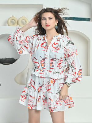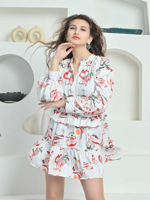 Perfect brunch cute dress with beautiful gather detail on the waistband and multicolor abstract print, self button details and chic fit is important to grab this season. Silvia Multicolor Abstract Print Short Length Dress with Raglan Long Sleeves Nice Elasticated Details on The Sleeves.