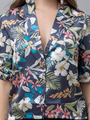 The top features a luxurious satin finish that adds a touch of elegance to its overall appearance. The fabric drapes beautifully, accentuating the wearer's silhouette while providing comfort and ease of movement. The all-over floral pattern includes a variety of blooms and leaves in shades of white, pink, blue, and green, creating a lush, tropical feel.