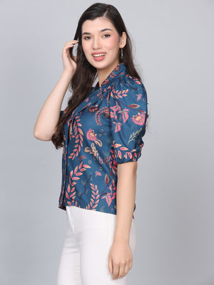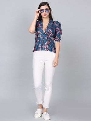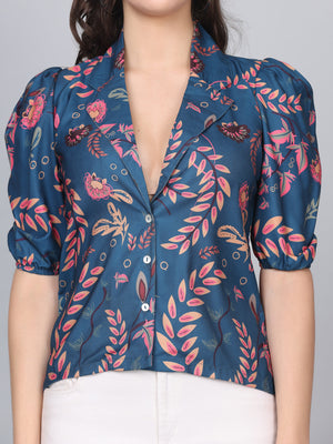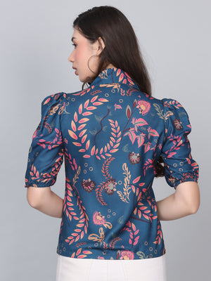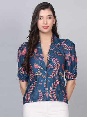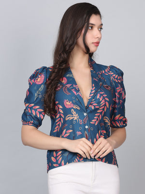 While the floral print and vibrant colors make this top an excellent choice for spring and summer wardrobes, it can also be layered under cardigans or jackets for winter seasons. The rich peacock blue color with multi print allows for year-round wear when styled appropriately. This floral top is not just a simple top; it's a mood-lifting piece that brings a touch of nature's beauty to your everyday style. Whether you're heading to a casual brunch or a semi-formal event, this top will ensure you look effortlessly chic and ready for any occasion.